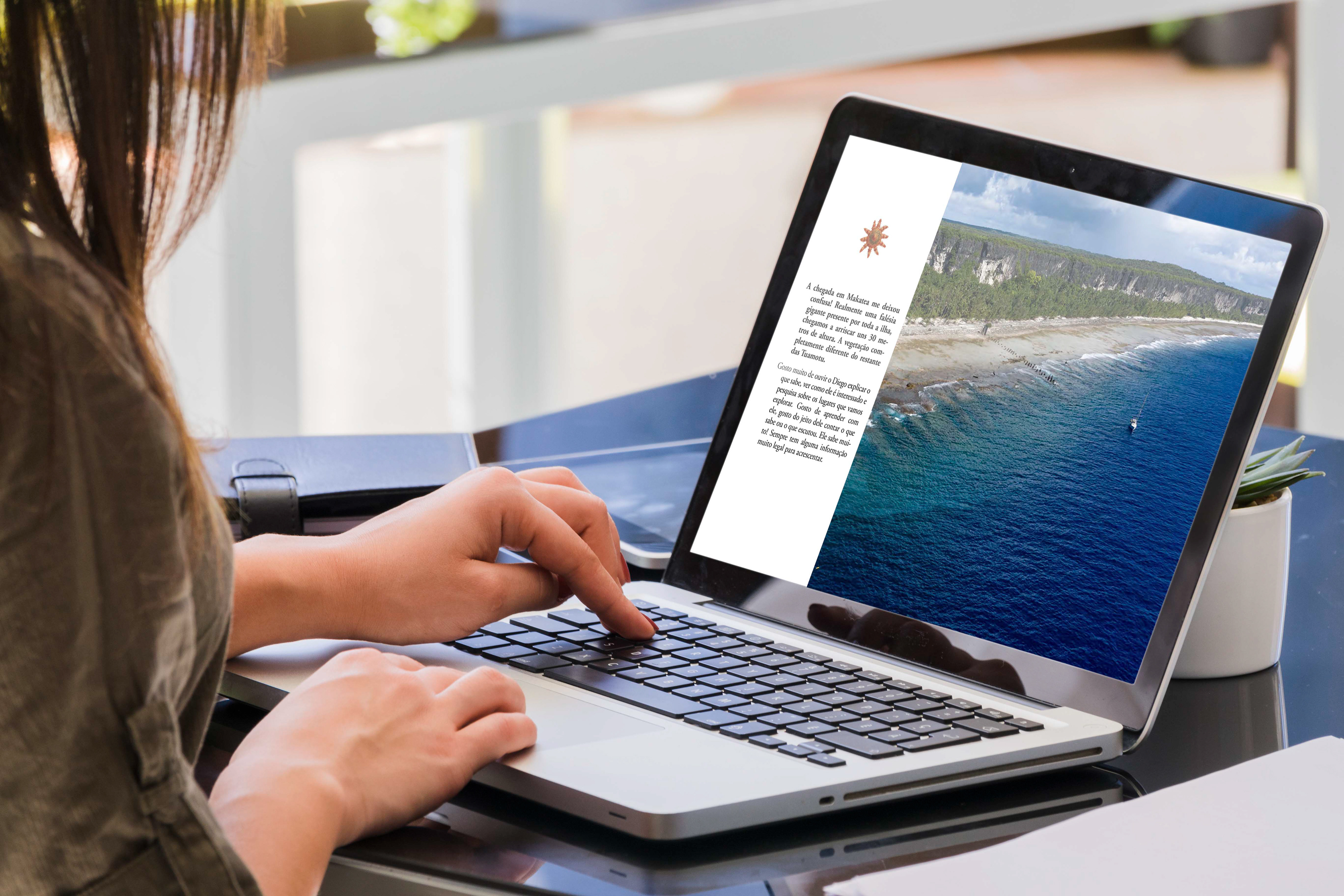 Ela precisava de alguém para diagramar um texto sobre sua última viagem a trabalho pela Polinésia Francesa, a bordo de um veleiro. E que trabalho incrível! Nos conectamos, e eu fiz a diagramação desse diário de bordo, ilustrado com imagens de tirar o fôlego — paisagens tão surreais que parecem de outro planeta.